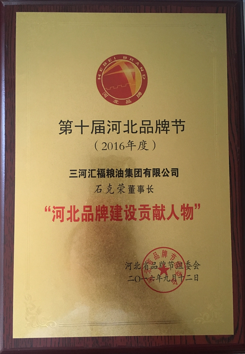 2016年9月12日,由河北省发改委、省质监局等十单位联合举办的第十届河北品牌节暨河北省质量品牌发展大会上,三河汇福粮油集团有限公司荣获“河北名片”荣誉称号;三河汇福粮油集团有限公司董事长石克荣先生被授予“河北品牌建设贡献人物”称号。